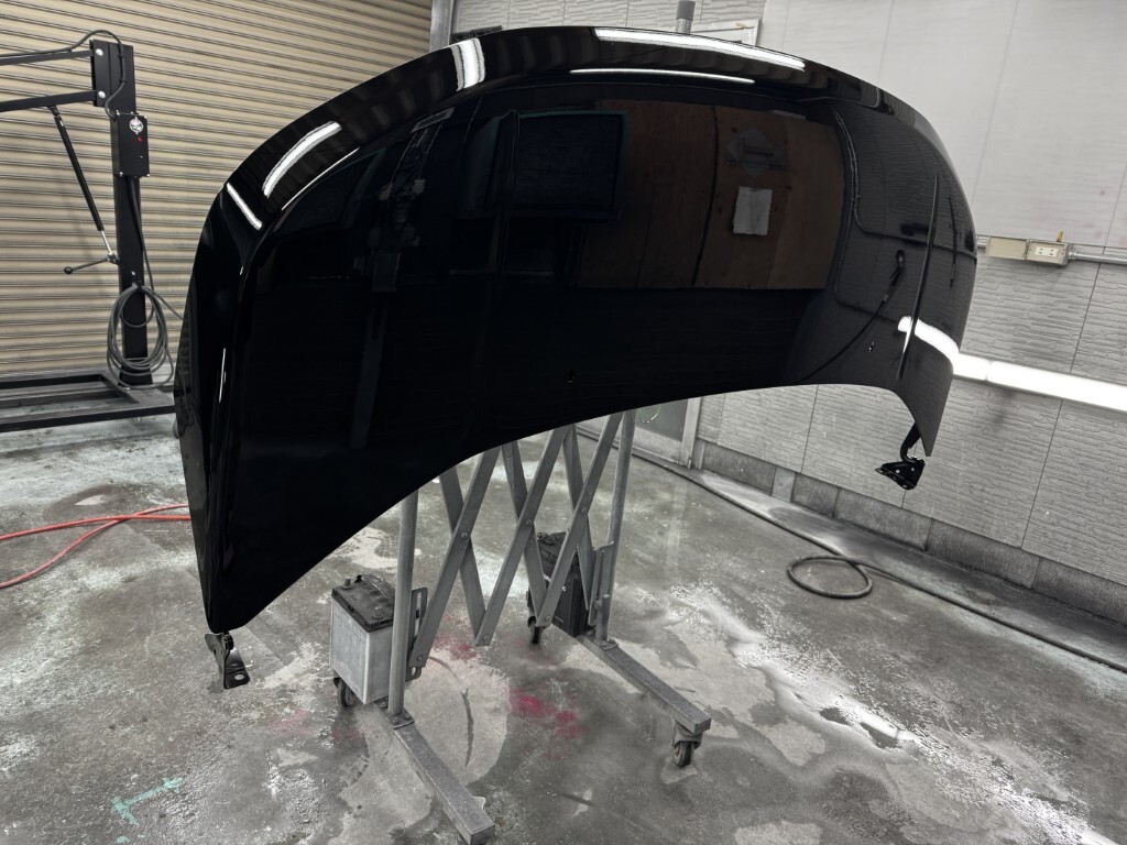 新品パネルは新車時と違い、純正色に塗装されておらず黒色電着仕上げになっていますので新車時と同じ中塗り色を先に調色塗装します。