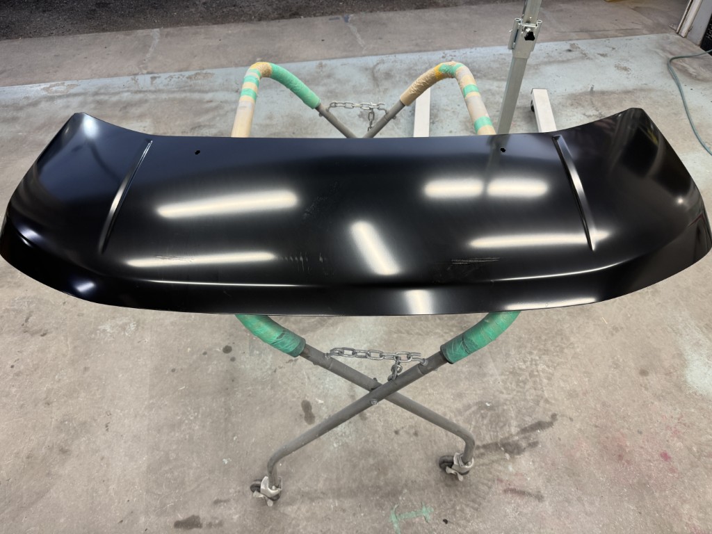 新品パネルは新車時と違い、純正色に塗装されておらず黒色電着仕上げになっていますので新車時と同じ中塗り色を先に調色塗装します。